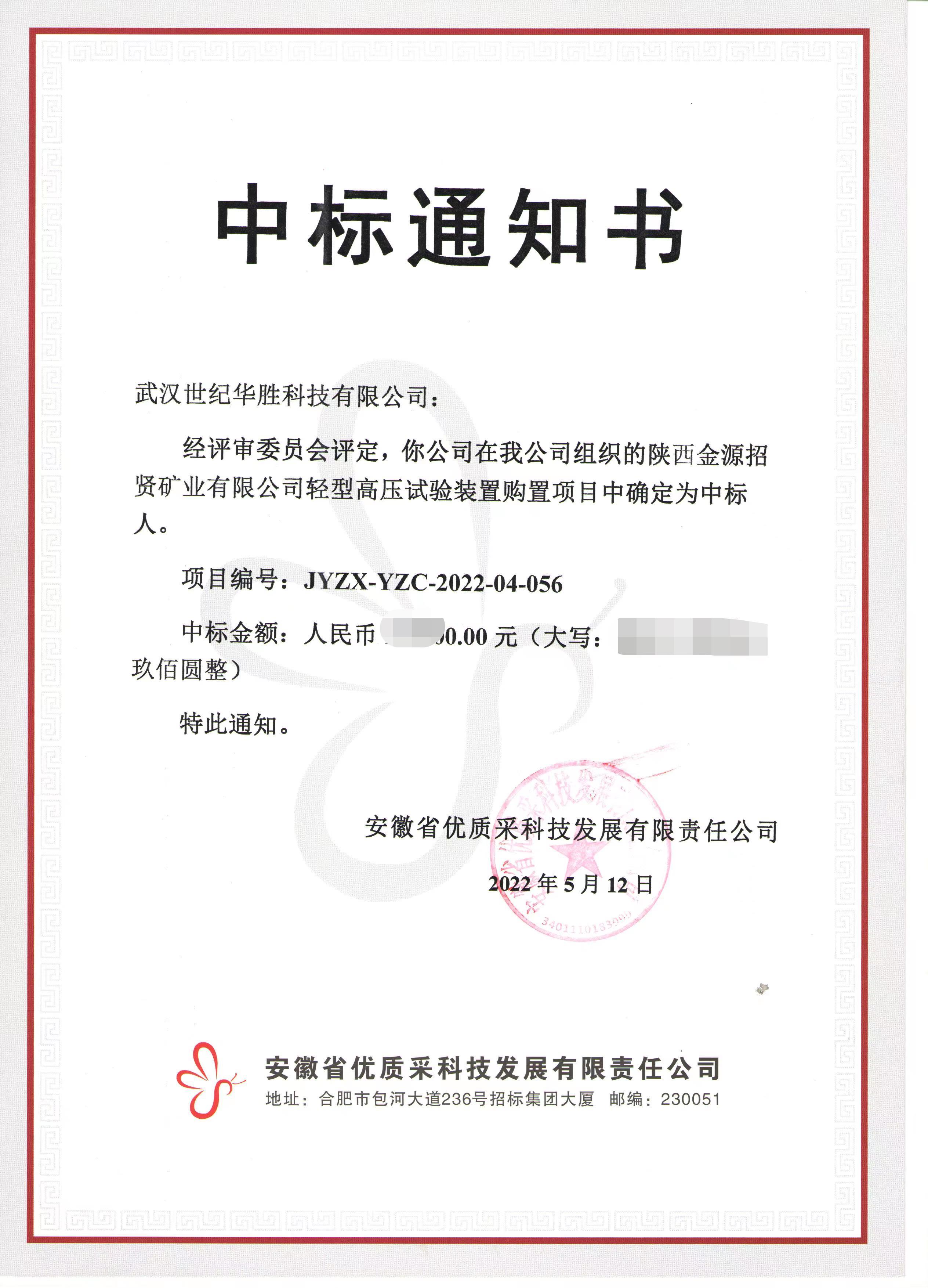 武漢世紀(jì)華勝科技有限公司在陜西金源招賢礦業(yè)有限公司輕型高壓試驗裝置購置項目中中標(biāo)