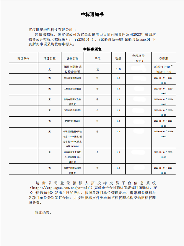 熱烈慶祝武漢世紀(jì)華勝科技有限公司在宜昌永耀電力集團(tuán)有限責(zé)任公司2023年第四次物資公開招標(biāo)項(xiàng)目中標(biāo)